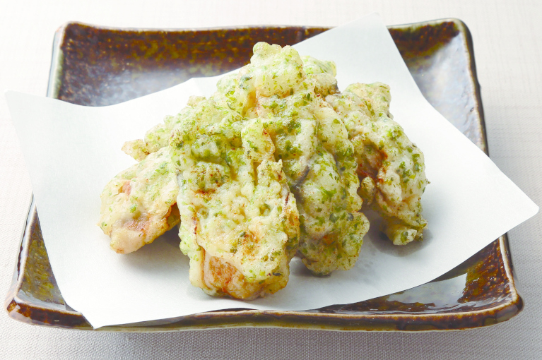 目にも美味しさが伝わる艶々で大きい広島産の牡蠣を使い、天粉に青さのりを合わせた衣をつけて香り良くサっと揚げました。揚げたての牡蠣は外はサクサクで中はふっくら。調理師の技が濃厚な牡蠣の旨みを引き出します。