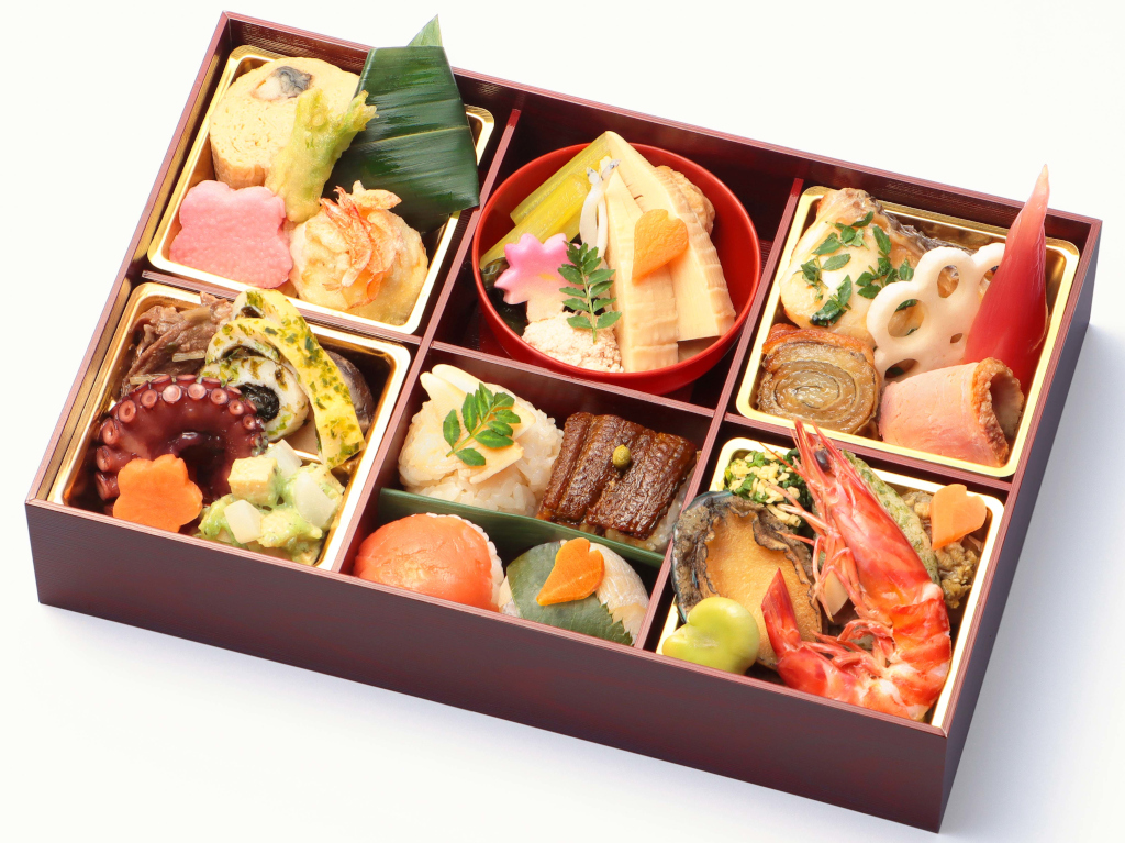 鯛の木の芽焼きに筍と独活の木の芽和え・蕗のピリ辛煮など春の味覚を調理師が丁寧に仕立て、ふんだんに盛り込んだ特別な一品。ご飯には旬の筍ご飯に美濃吉特製のうなぎ寿司と手まり寿司が入ります。お花見や行楽のお集りに是非ご利用ください。