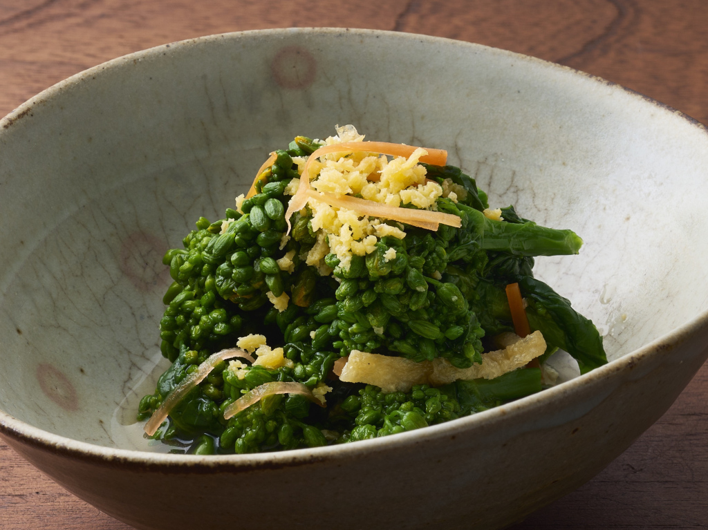 菜の花特有のほろ苦さと辛子のキレが調和した、口当たりの良い一品です。